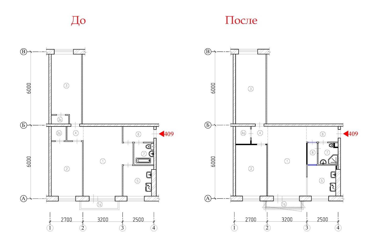 В данном примере приведена согласованная классическая перепланировка для панельного дома: бывший проём из коридора на кухню был заложен, за счет самого коридора, ранее ведущего в кухню, произведено расширение объединенного санузла и устройство уборной, а новый проход в кухню осуществлён из комнаты путём устройства проёма в несущей стене с усилением металлической рамой. Такой тип перепланировки в панельных домах встречается очень часто и в большинстве случаев может быть успешно реализован. Только настоятельно не рекомендуем выполнять проём в несущей стене без получения на это предварительного соответствующего разрешения.