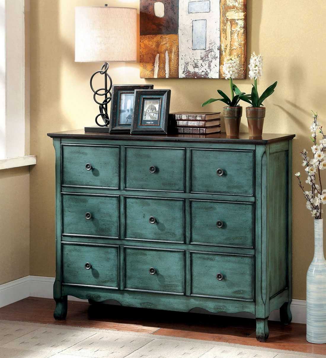 Практически в каждой комнате, выполненной в стиле винтаж, присутствует оригинальной формы и отделки комод или сундук, бюро, буфет или трюмо. Именно такие предметы чаще всего сохраняют налет старины, потому что в современных каталогах мебельных фабрик они просто отсутствуют.