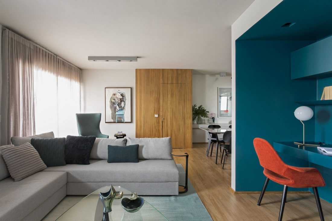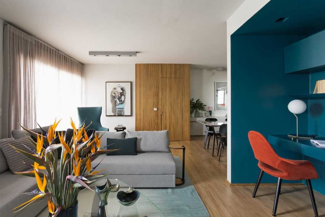 - Контраст цветов в интерьере. Многие дизайнеры предпочитают использовать небесно-голубые краски и сочетать их вместе с ярким, сочными цветами зелени, лаванды, яркого желтого, красного и оранжевого оттенка.