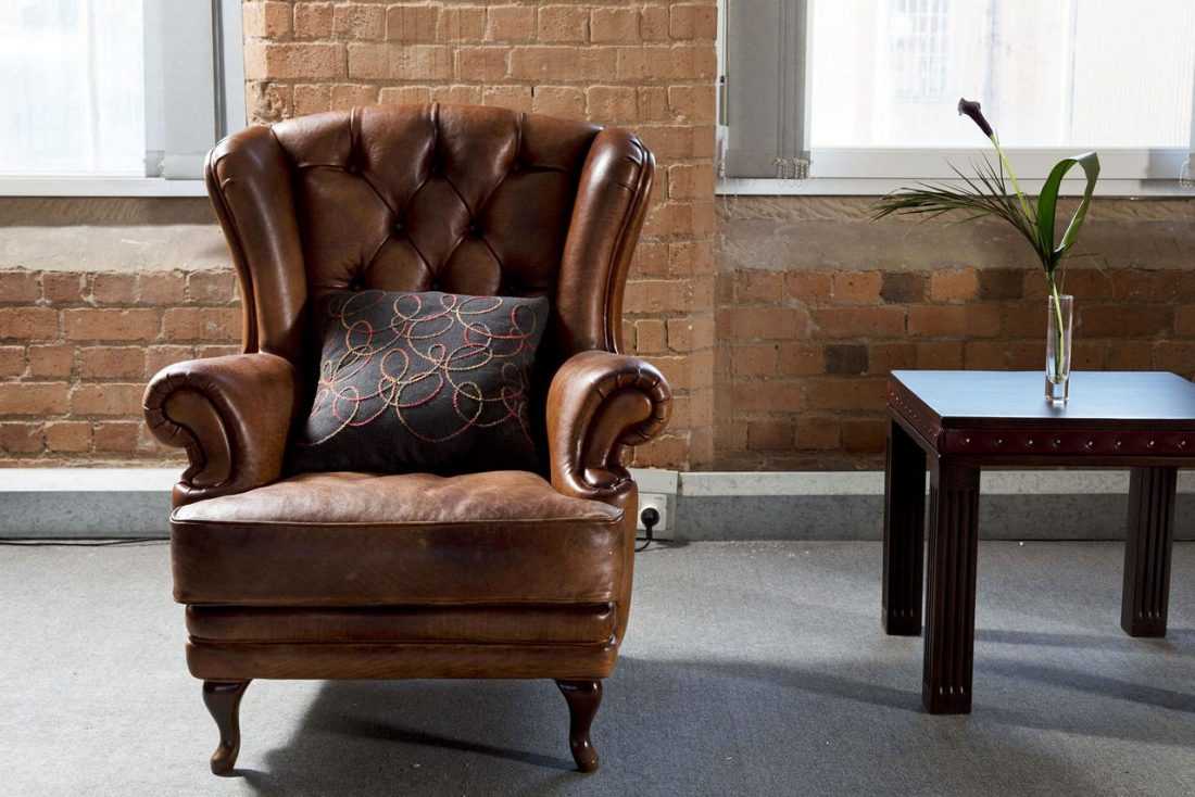 Гармоничным будет кожаный диван или кресло на изогнутых ножках. Но это не тот мягкий уголок, который свидетельствует о достатке своих хозяев, а деревянная мебель, только часть которой обита кожей.
