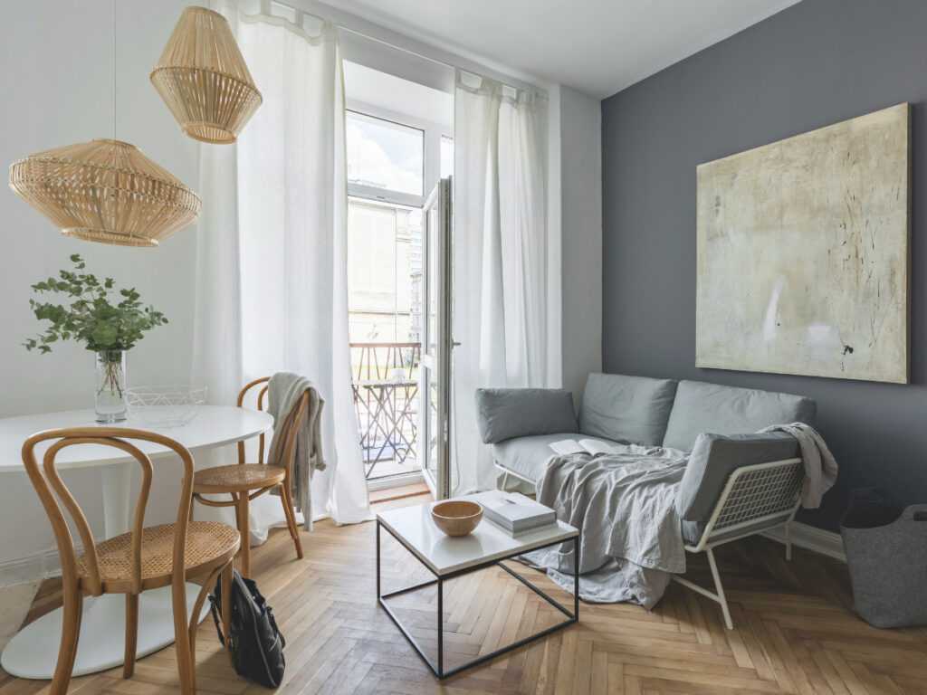 Этот вариант считается универсальным. Используются классические оттенки, к ним относятся бежевый, серый и белый. Комбинируя эти тона с другими, вы сможете создать классическое решение, которое будет всегда выглядеть современно и красиво. В таком случае вам не надо будет постоянно менять интерьер комнаты при покупке новой мебели, замене покрытия пола или других элементов.