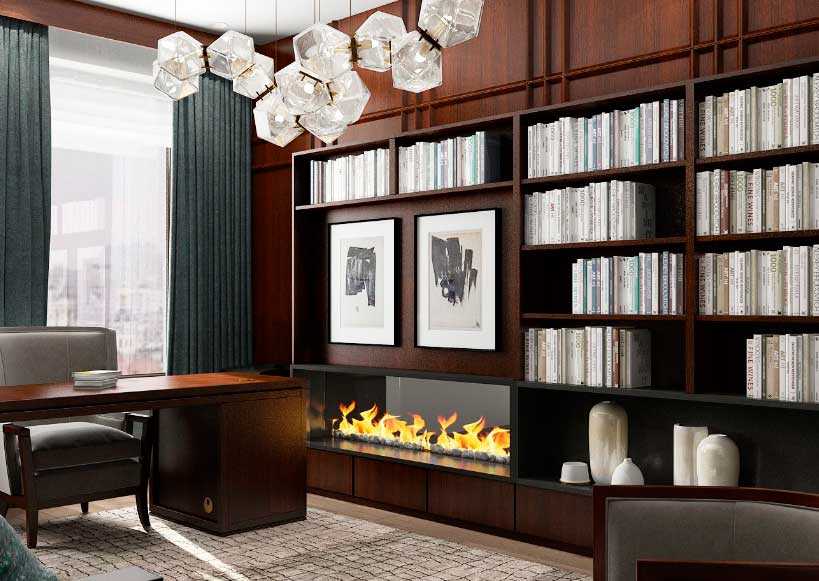 Шкафы, книжные полки с застекленными дверками, подобранный со вкусом декор полностью вписываются контемпорари-стиль.