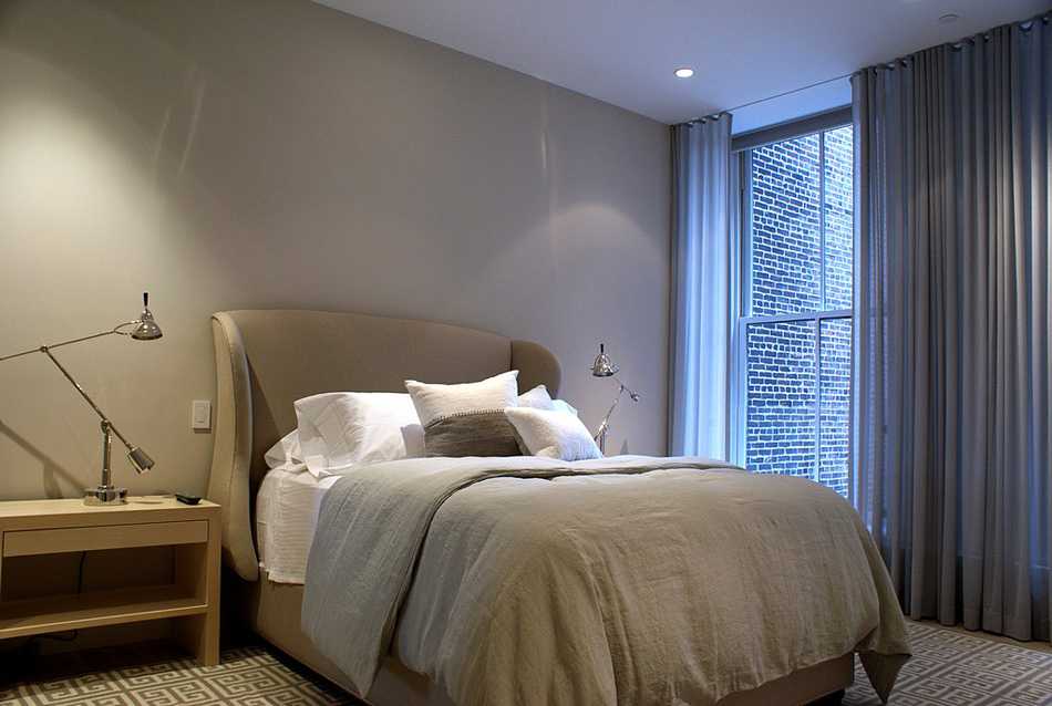 Оконные проемы закрывают при помощи штор блек-аут. Если в спальне есть рабочее место, над ним оборудуют дополнительное освещение, стену над рабочим столом декорируют в более светлых тонах.