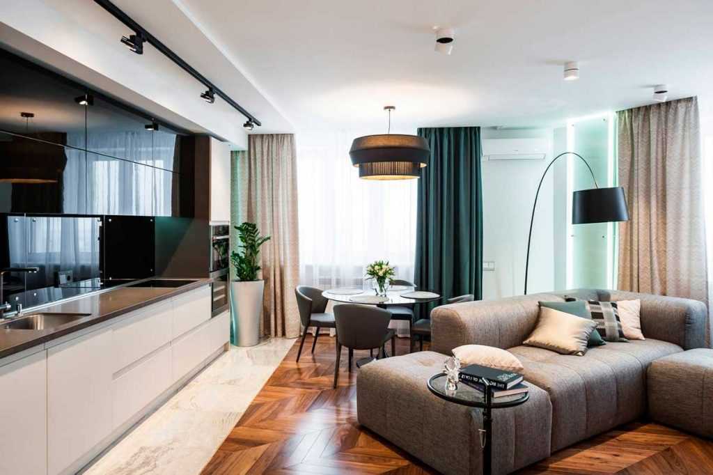 Таким образом, стал популярен Контемпорари стиль в интерьере гостиной, совмещенной со спальней или кухней.