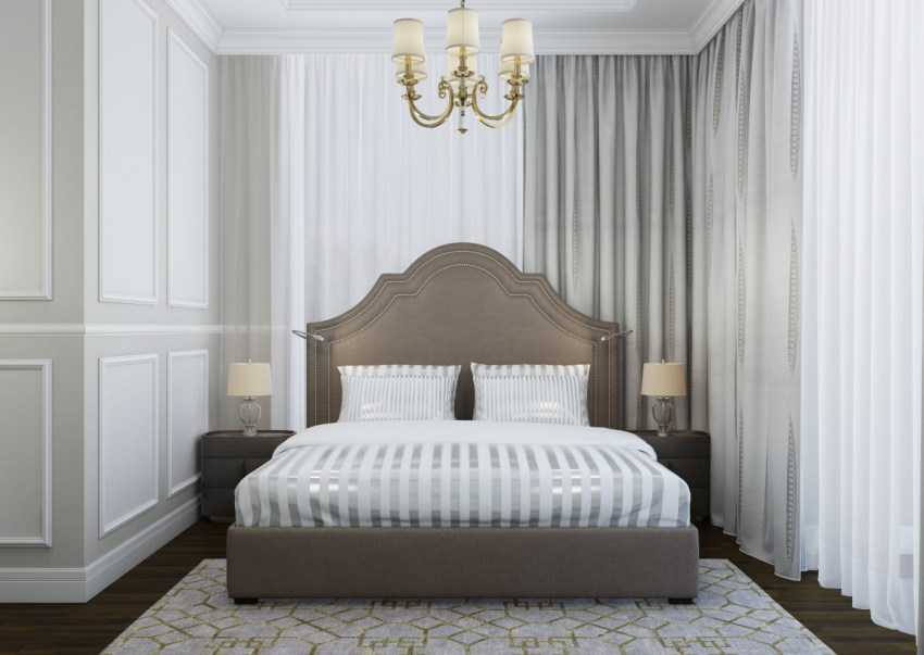Элегантные бра с золотистым каркасом, стеганое мягкое изголовье кровати, лаконичный лепной декор, шторы из бархата – каждая деталь в интерьере неоклассической спальни, оформленной в светлых тонах, поражает изяществом и располагает к отдыху.