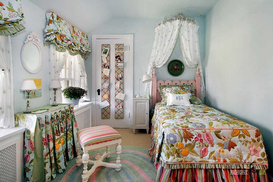 Если спальня выполнена в стиле кантри или другом деревенском стиле, где активно используются разнообразные текстильные украшения, уголок для создания женской красоты уместно задекорировать занавесками с принтованным рисунком. Так можно подчеркнуть единство оформления комнаты: