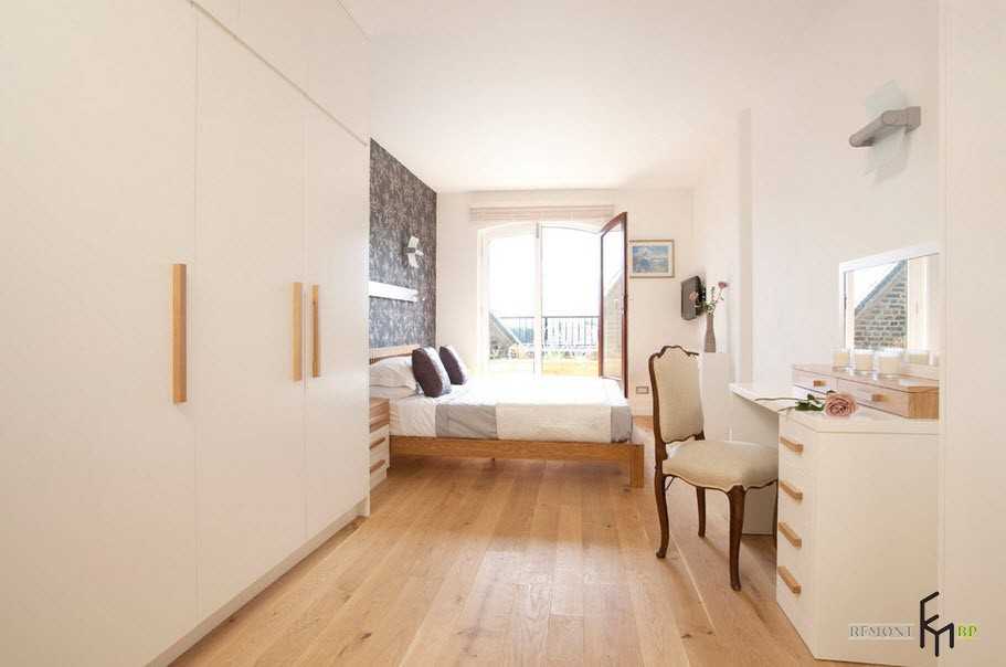 Белый цвет зрительно расширяет любое помещение, а для комнаты с гардеробными шкафами это очень важно. Туалетный столик должен соответствовать цветовой гамме всей остальной мебели, что не создаст диссонанса в интерьере: