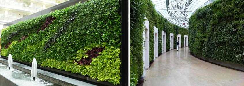 Модернизированные установки обладают системой очищения. Она включает в себя равномерное опрыскивание зелени в определенный промежуток времени. На фото вертикального озеленения представлены лучшие дизайнерские проекты.