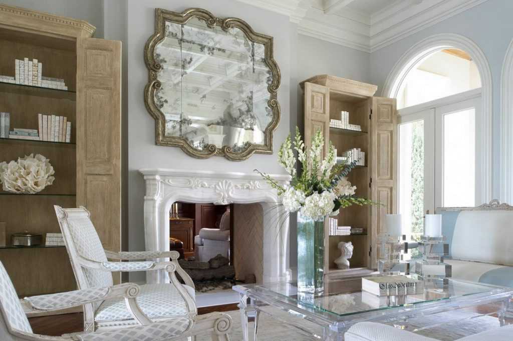 Для интерьера гостиной в стиле прованс подойдут зеркала правильных геометрических форм с утонченной рамой. Уместны различные узоры и пастельные тона.