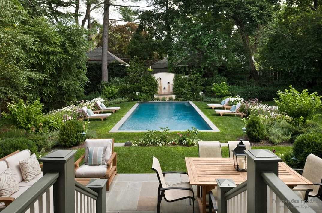 Если вы на специализированных сайтах увидите дизайн двора частного дома с бассейном на фото, то вы поймёте, что для него идеально подходит открытый водоём, прекрасно приспособленный для отдыха на природе. Он позволяет не только поплавать, но и с удобством позагорать рядом с водой. Естественно, что основным элементом дизайна здесь станет пляжная мебель. Но существует серьёзный недостаток такого бассейна – он не может функционировать зимой.