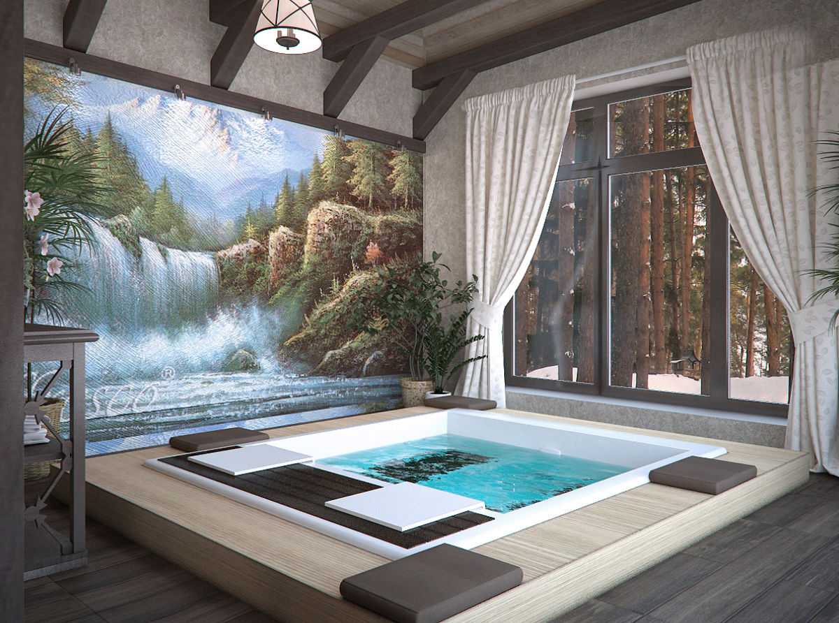 Если вы привыкли проводить выходные за городом и являетесь владельцем большого коттеджа, вариант организации водоёма на 1-м этаже будет как раз кстати. Поднимать огромный объем воды на второй этаж не рекомендуется из соображений безопасности. К тому же, возникнут определенные сложности при организации инженерной системы.