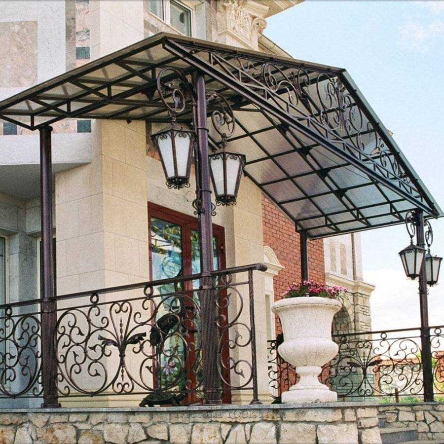 Как правило, навес является продолжением конструкции кровли и вместе с крыльцом несет немалую функциональную нагрузку – защищает от солнца, осадков. Обеспечивает комфортный вход в помещение. Если архитектура здания такова, что продолжить кровлю для обеспечения даже небольшого навеса над главным входом не получается, то можно организовать небольшой козырек, который не только возьмет на себя часть функционала, но и разнообразит экстерьер здания, а при удачном или оригинальном исполнении – украсит его.