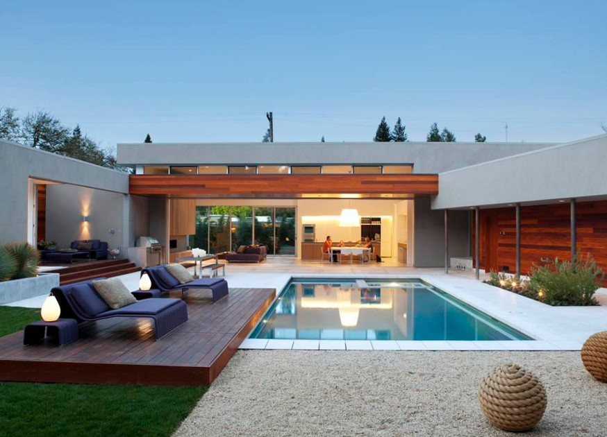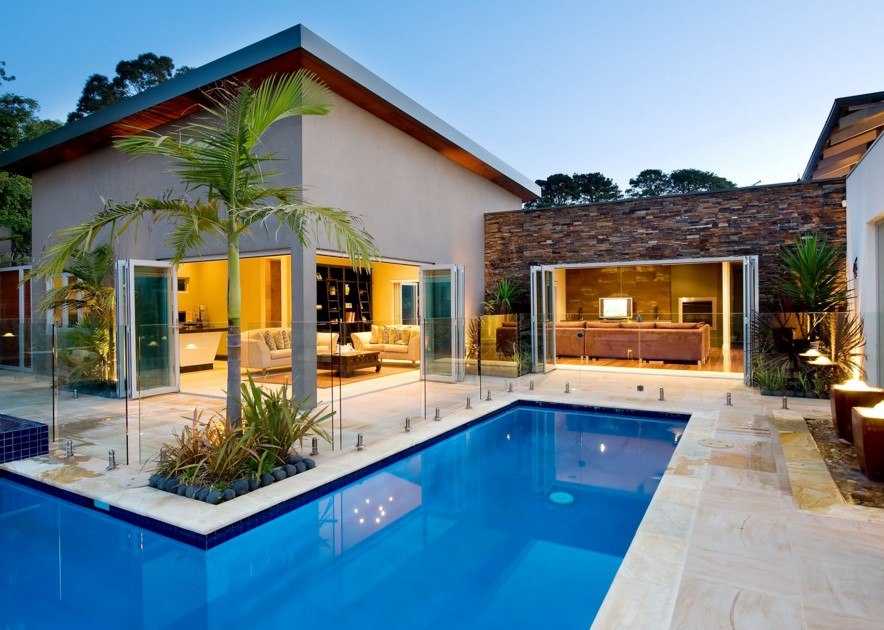Сделать красивым задний двор можно, разместив на нем плавательный бассейн. К примеру, узкий бассейн станет прекрасным дополнением для всей семьи в летний период.