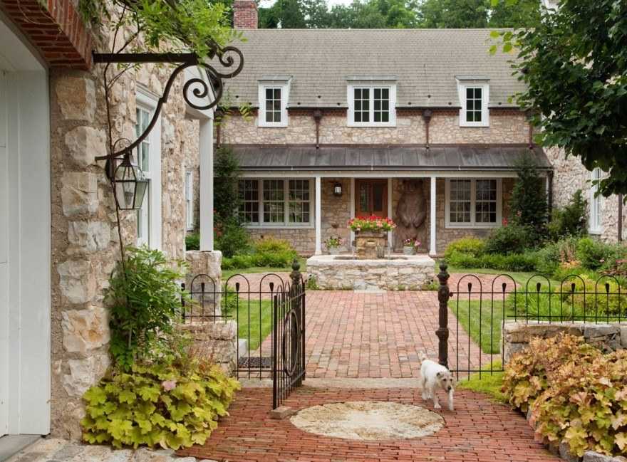 Дорожки в ландшафтном дизайне частного дома в деревне рекомендуется отделывать натуральным камнем, плиткой или галькой. Также провинциальный дворик можно смело украшать цветущими растениями, не боясь «переборщить».