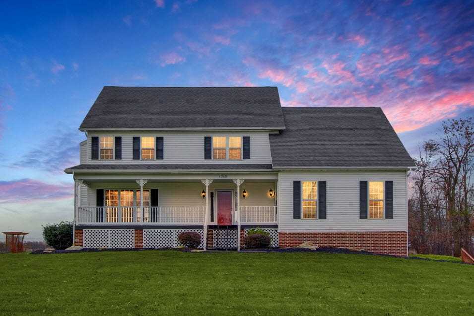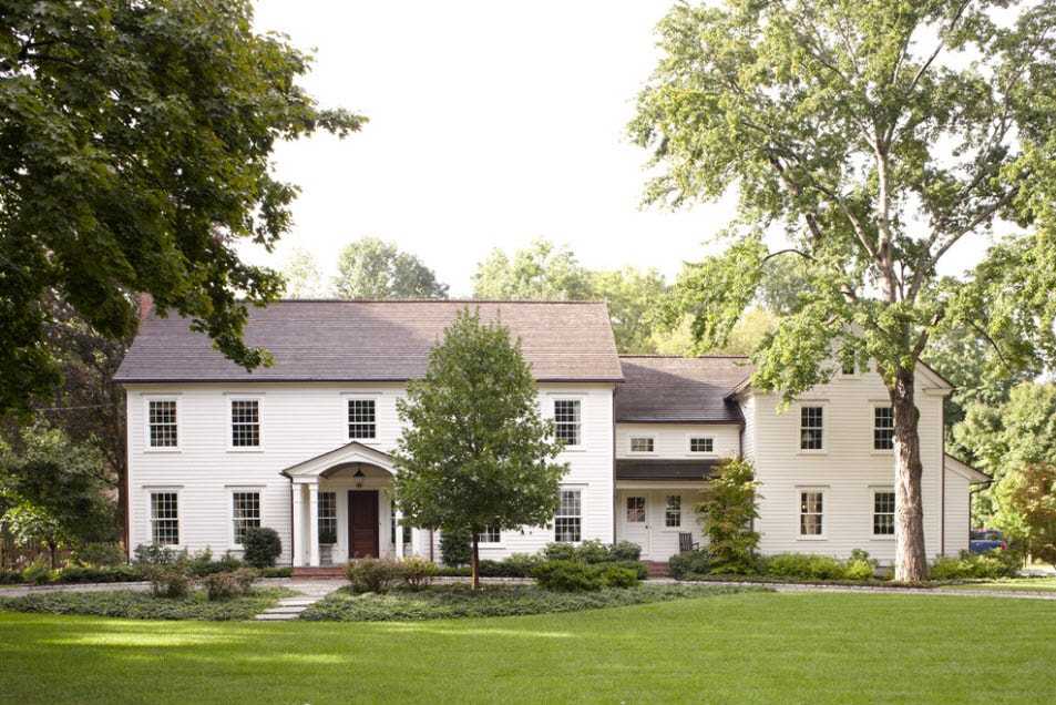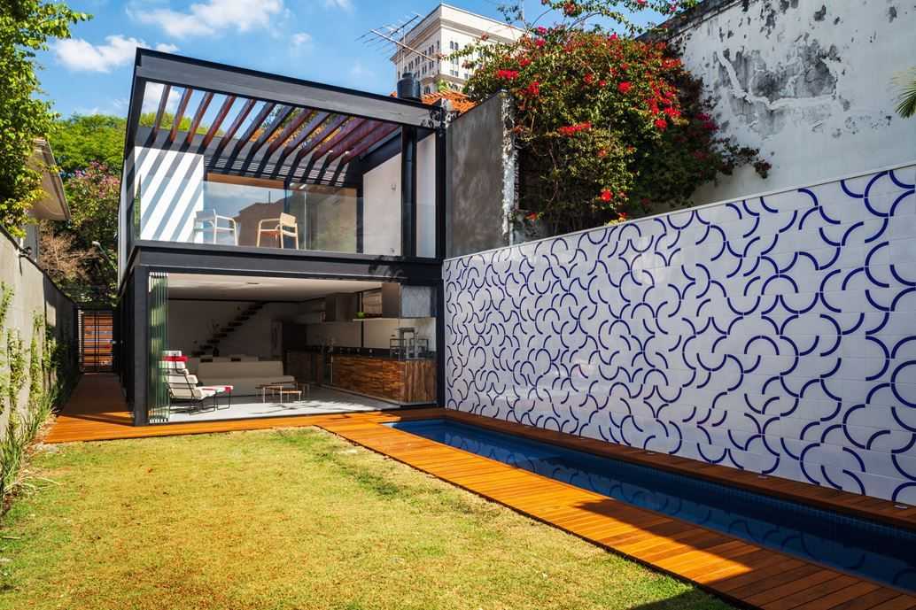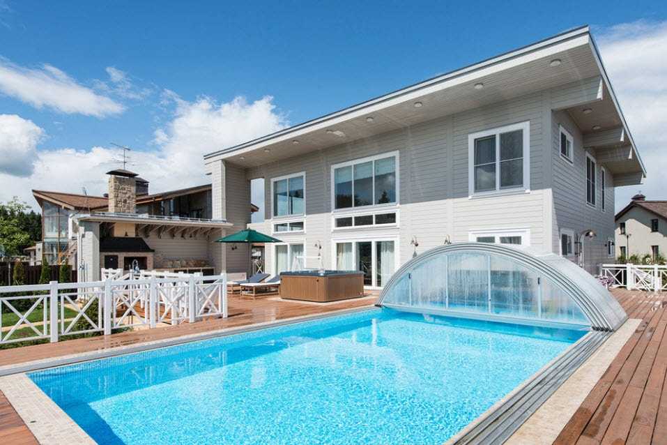 Двухэтажный дом с пристроенным навесом и бассейном на заднем дворе