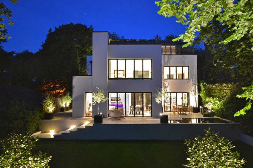 На динамичности также сказывается наличие нескольких уровней в пространстве. Расположение зон отдыха, террас продумано так, чтобы они, получали достаточное количество света, но при этом были скрыты за красивым фасадом двухэтажного дома и ограждением.