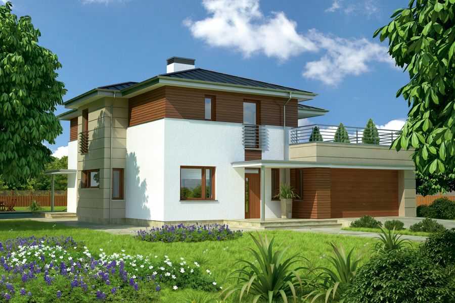 Интересный пример проекта двухэтажного дома представлен на следующем фото. Главная его особенность – функциональный гараж для двух машин, крыша которого используется как просторная терраса (выход на нее спланирован со второго этажа). Очень эстетично и со вкусом устроен внешний фасад дома, где отделка гаража и второго этажа имитирует брус – эффектный контраст, способствующий гармоничному восприятию экстерьера постройки в целом.