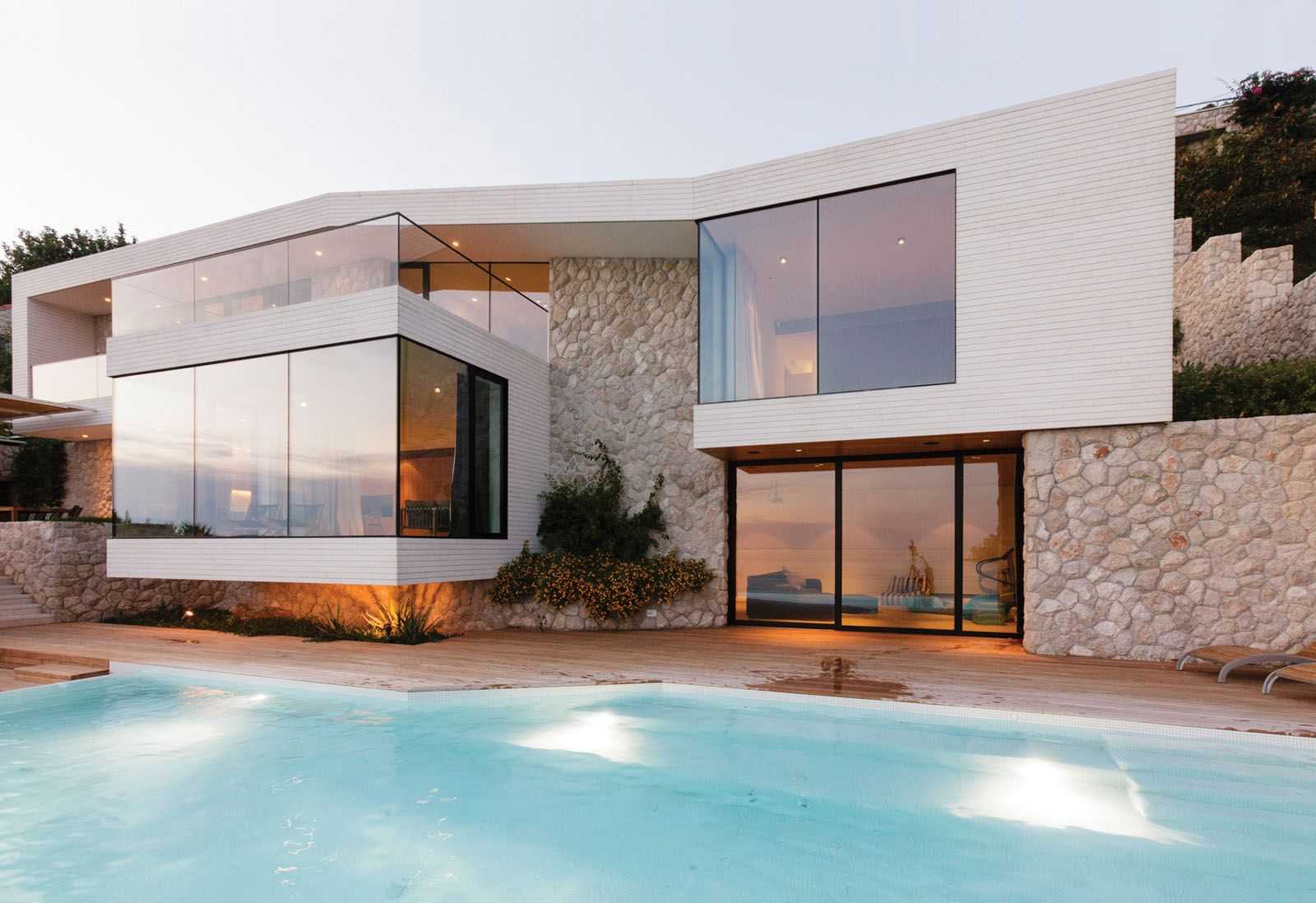 Гостиная, спальни расположены таким образом, чтобы максимально взаимодействовать с внутренним двором. Отсюда выходят виды на бассейн и есть непосредственный доступ к нему. В целом дом представляет собой набор разных по назначению пространств, объединенных в единый, полноценный жилой объект.