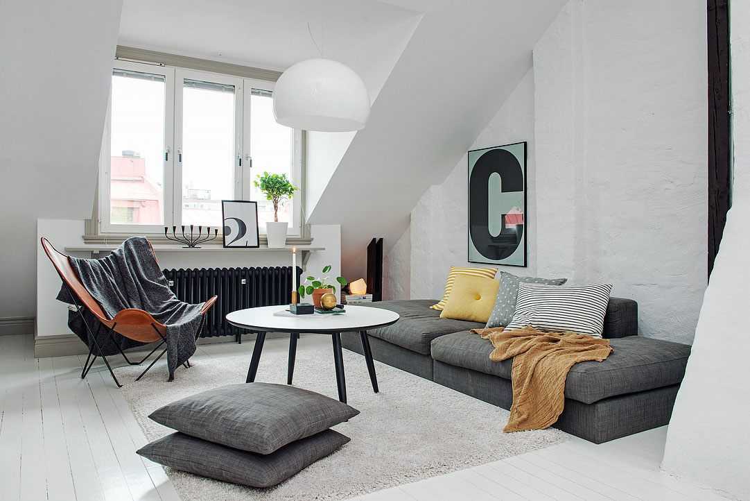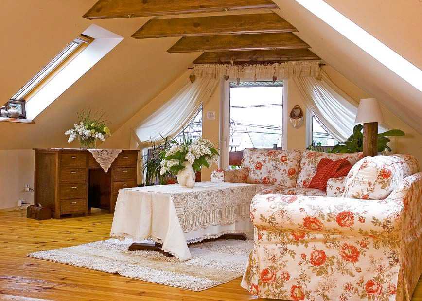 Не менее интересный и привлекательный вариант – обустройство гостиной, где можно собраться всей семьей. Конечно же, гостиную лучше располагать на просторном чердаке, подстроив ее под свои потребности. Мансардные окна можно прикрыть шторами, а мебель расположить нужно так, чтобы рядом с проемом был диван или кресло. Конечно же, скошенные стены внесут некоторые ограничения, ведь такие атрибуты, как высокие стеллажи и шкафы здесь неуместны.
