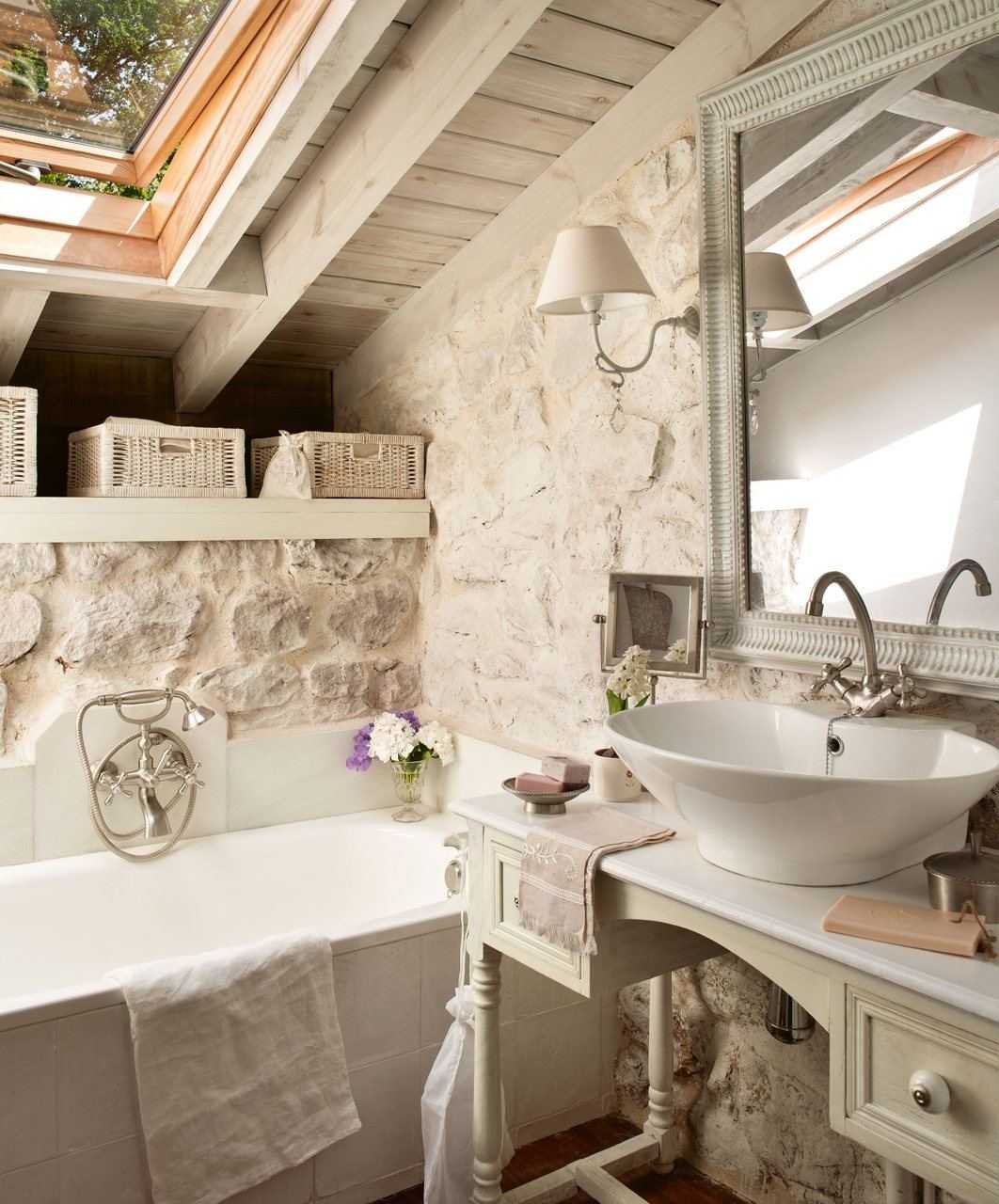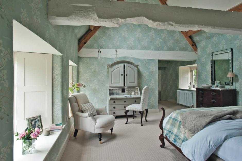 Оформляя спальню в мансарде, можно использовать разные интерьерные стили, хотя некоторые из них все же остаются наиболее актуальными. Так, форма помещения со скошенной крышей отлично подходит под все направления деревенской стилистики, в особенности стиль кантри и прованс. В этих стилях особенно удачно смотрятся балки на потолке под крышей, поэтому закрывать их вовсе не обязательно, и дизайнеры даже рекомендуют в любом случае задействовать их в оформлении.