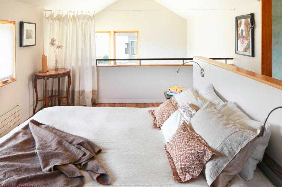 В стиле лофт практически отсутствует разделение помещения на зоны, что вполне осуществимо на мансарде. Весь чердак будет задействован под спальню, отсутствие стен и массивных перегородок позволит получить больше пространства. К тому же, для такого стиля на чердачном этаже легко оформить кирпичные стены и, опять же, не нужно прятать балки.