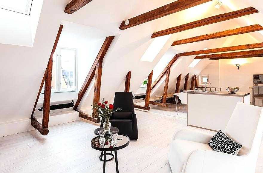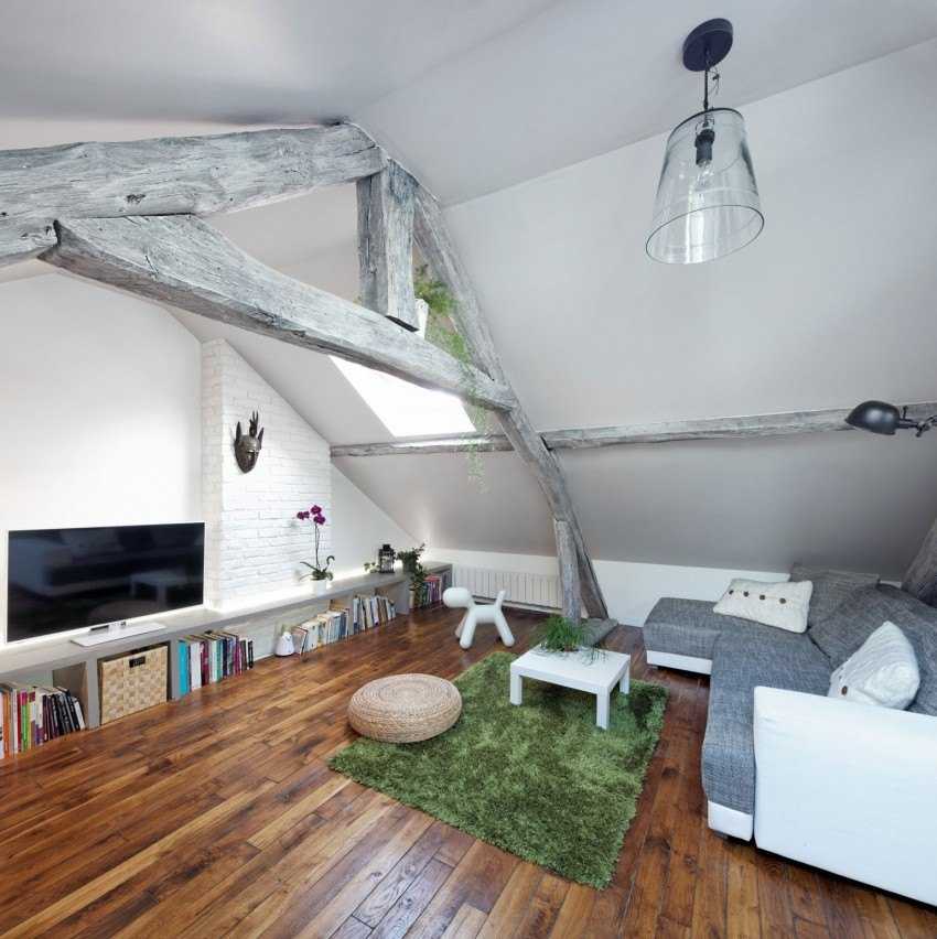 С помощью детально продуманной композиции досок можно также имитировать структуру крыши на чердаке, который скрывался в теплоизоляции. Открытая конструкция крыши с балками подходит не только чердачным интерьерам с идиллическим или деревенским декором, но и современным стилизациям чердачных промышленных мансард. На чердаке деревенского стиля видимая деревянная конструкция должна иметь естественный или затемненный цвет, в скандинавском — лучше всего разрисовать поверхности в пастельном цвете.
