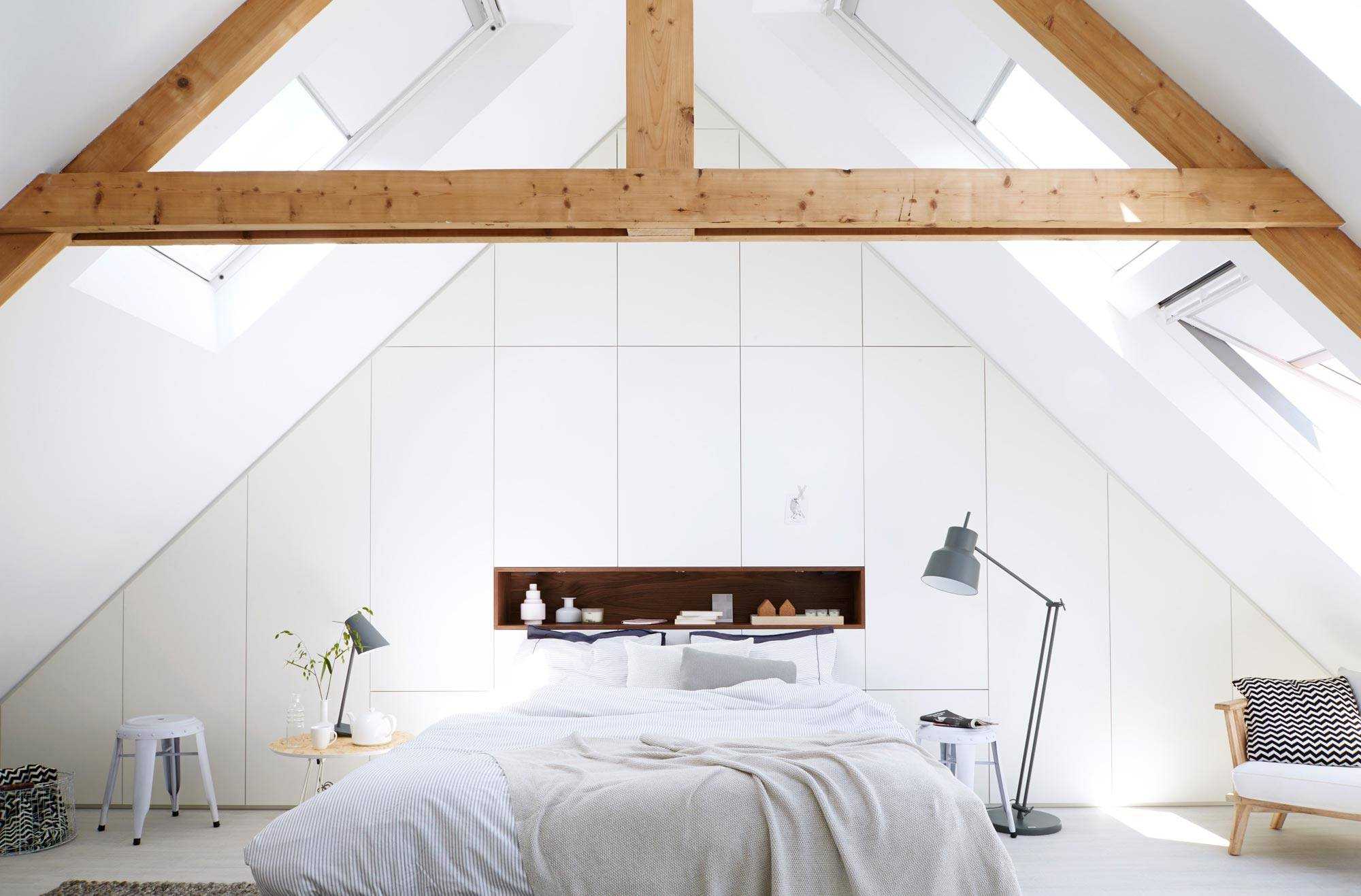 Минималистический интерьер спальни на мансарде – беспроигрышное решение. Используйте как можно меньше мебели, аксессуаров и декора, а также простые геометрические формы в оформлении.