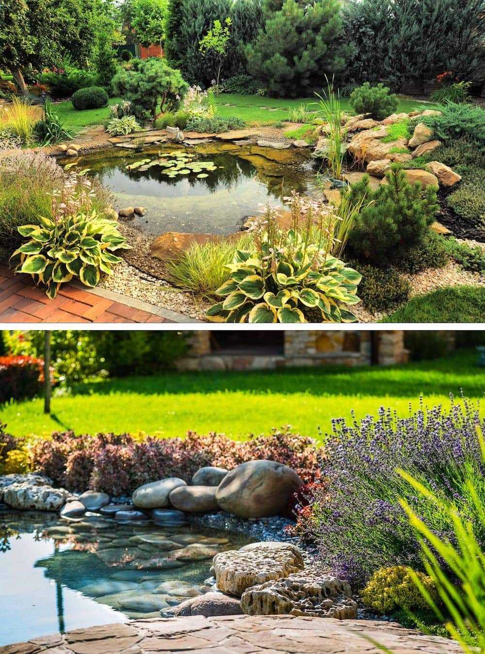 Создать гармоничную атмосферу естественности природы поможет искусственный водоем. Если площадь участка маленькая, это может быть небольшой пруд, на обширных территориях есть возможность построить бассейн. Для создания маленького пруда понадобится выкопать неглубокую ямку, дно которой можно застелить пленкой.