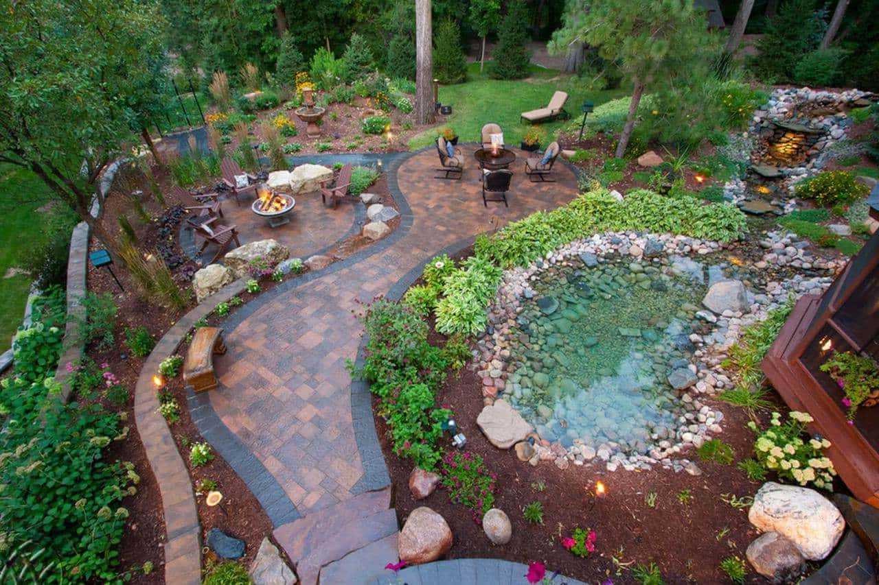 — Пейзажный стиль. Дизайн двора в пейзажном стиле выглядит иначе. В нем меньше структурированности, хотя посадки внутри самих клумб имеют аккуратную эстетику и выбраны строго по размеру кроны. Пейзажный стиль обычно включает в себя 5–10 клумб неправильной формы с плавными краями на территории всего участка, мягко перетекающих одна в другую, а дорожки выполнены из камня или засыпаны корой. Пейзажный стиль больше всего подходит под кирпичные дома.