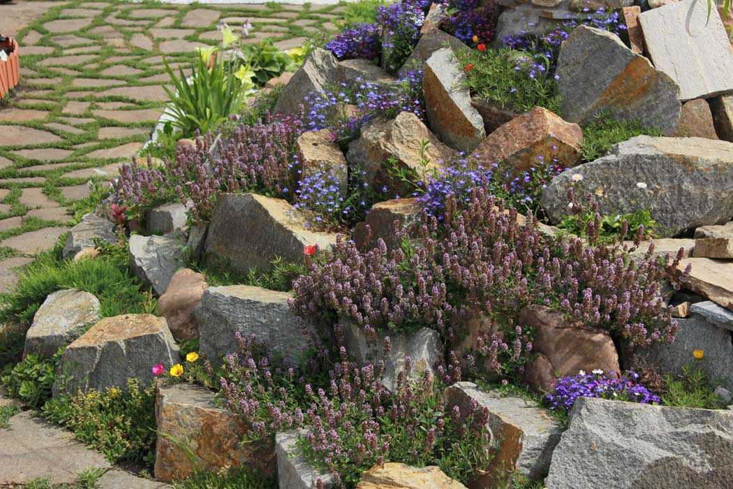 Размер камней должен соответствовать площади альпинария. Чем больше размер альпийской горки, тем более крупные валуны можно использовать.