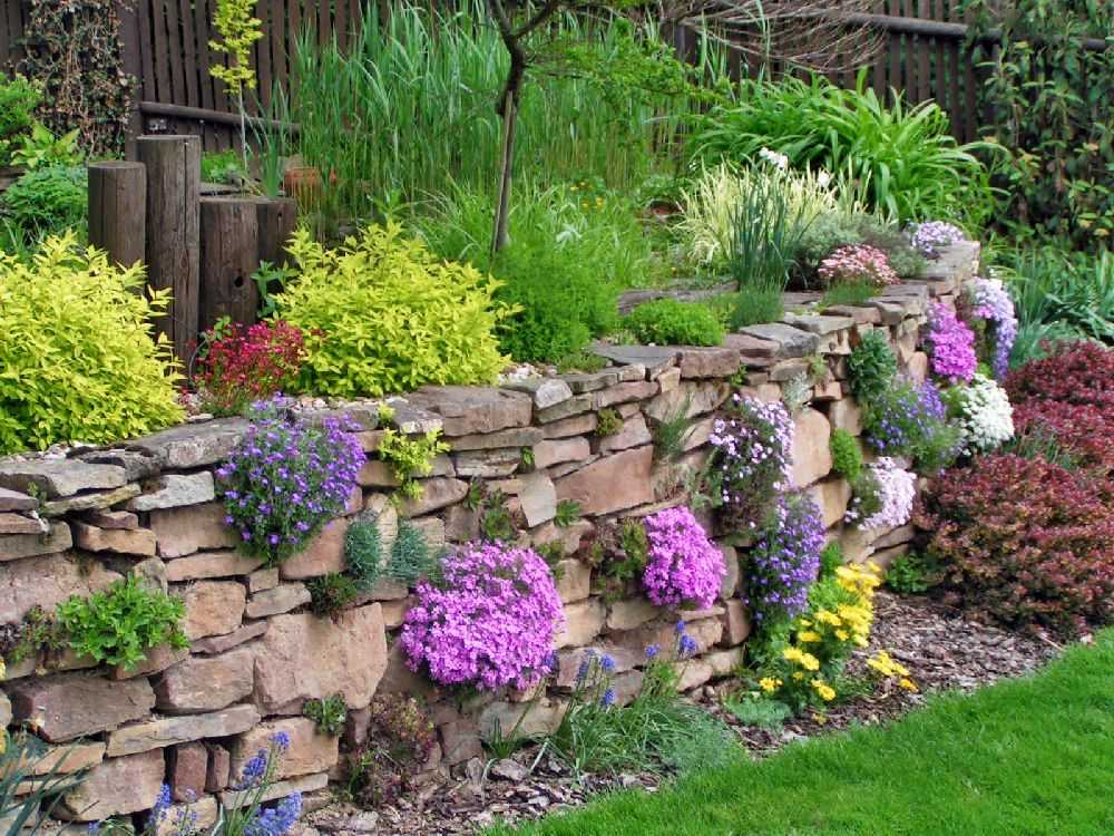 Виды альпийских горок — каменная стенка обычно выполняется из декоративного искусственного или натурального камня. Из натуральных камней чаще всего используются известняк и песчаник. Для создания каменной стенки не используется известковый раствор, а промежутки между камнями заполняются почвенной смесью, которая позволяет в вертикальных промежутках между камнями высаживать растения.