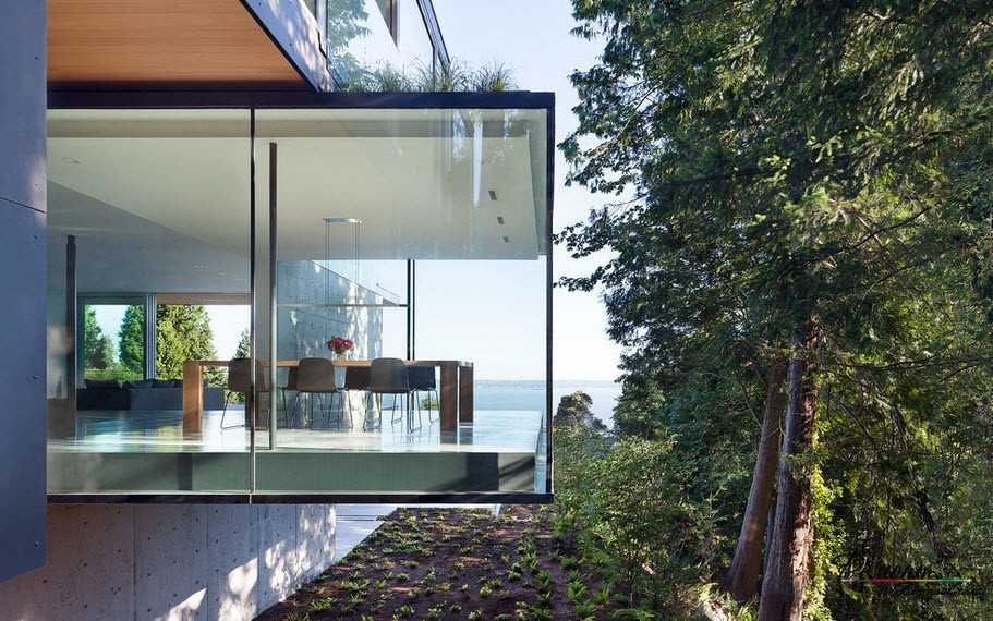 - Горизонтальная кровля. Стиль всячески поощряет многофункциональность; плоская крыша — идеальное место для смотровой площадки или террасы.