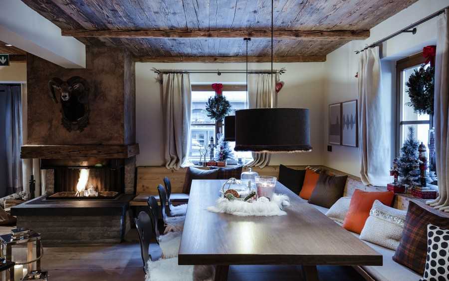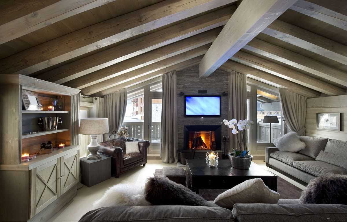 Важно! Избегайте в цветовой гамме выраженных контрастов, стиль шале привлекает своей легкостью и натуральностью. Для смягчения обстановки используют кожаную мебель, обивку с ворсом, меховые аксессуары светлого цвета, коврики подобранные под цвет напольного покрытия