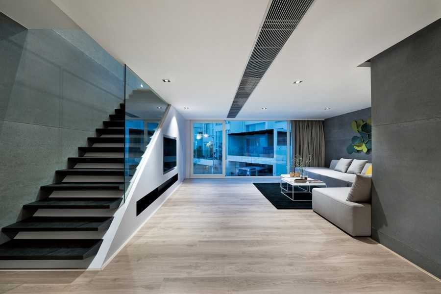 Гостиная. Мебели должно быть немного, а встроенная мебель имеет тот же оттенок, что и стены. В качестве напольного покрытия подойдет глянцевый ламинат, плитка, паркетная доска или линолеум. Для стен выбирают штукатурку или флизелиновые обои, которые со временем можно покрасить. Потолок — реечный, натяжной или подвесной, нередко с точечной подсветкой.