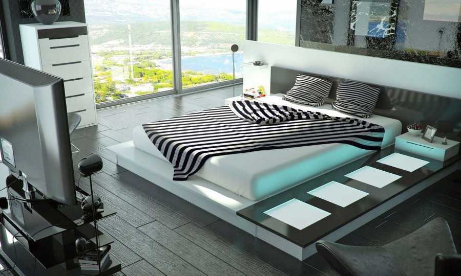 Спальня. Она выглядит не только функционально, но и изысканно, благодаря спокойным цветам стен и многоуровневому освещению с регулировкой яркости и оттенка ламп. Пол украшает неброский ковролин или ковер с высоким ворсом, на окнах — горизонтальные жалюзи или темные шторы. Уютными деталями служат абстрактные панно и монохромные фото на стенах, а также более насыщенные оттенки декора.