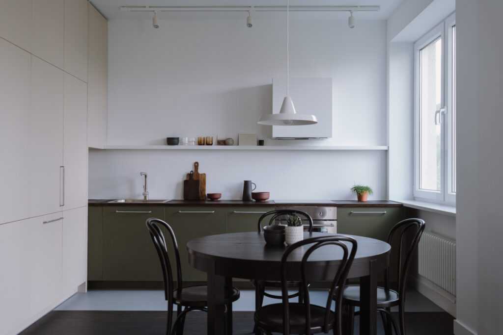 Здесь чаще всего используется сочетание зеленого с белым, серым металлическим или даже черным. Темные тона серого и цвета ночи – это характерная окраска для фасадов бытовой техники. Белый символизирует порядок и чистоту, что подчеркивает отсутствие чего-либо лишнего в интерьере такой кухни.