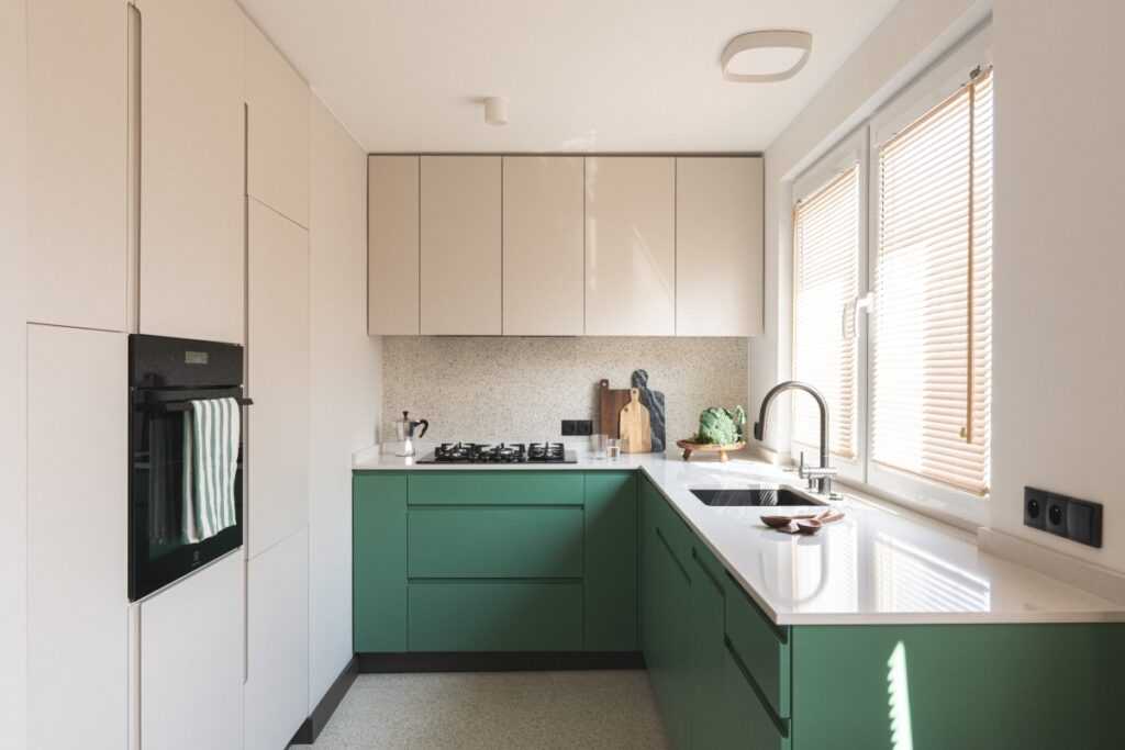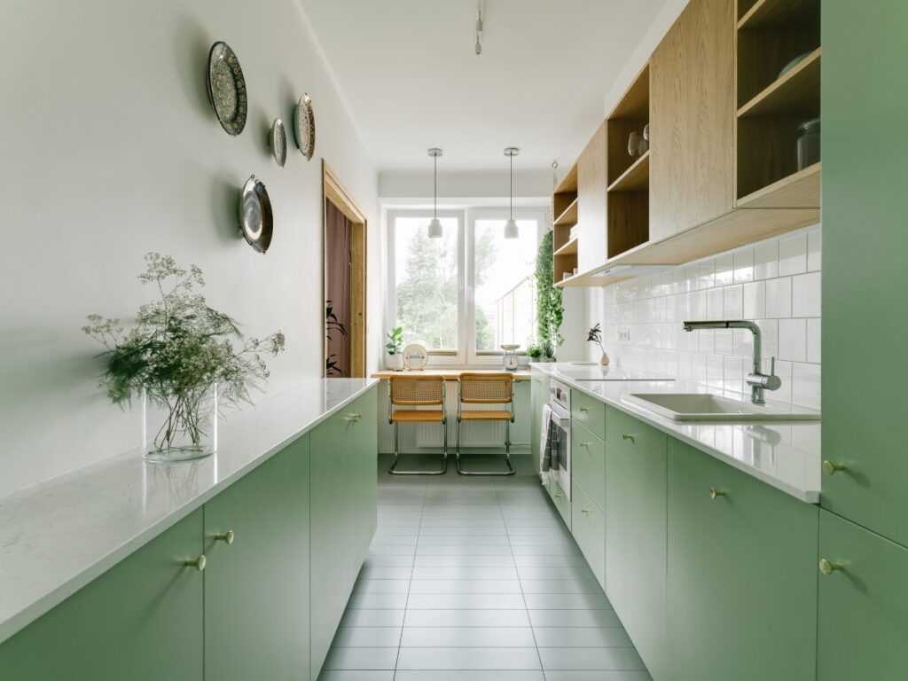 салатовый цвет великолепно гармонирует с серым и белым в кухне