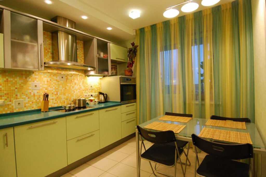 Здесь кухонный гарнитур может быть выполнен в достаточно ярко-изумрудном и даже лимонном цвете. Оформление остальной части помещения использует чаще всего светлые материалы. Но обеденные стулья и стол предпочтительны в натуральном древесном оттенке.
