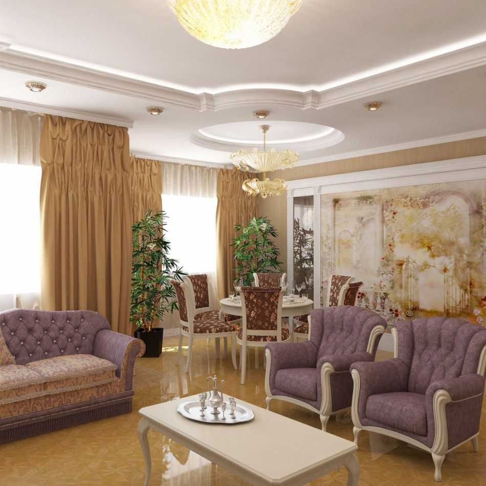 Традиционно, пол из паркета, можно с красивыми узорами. В планировках часто применяются арочные проемы, многоуровневые потолки оригинальных форм. Дополнительно можно сделать камин, это станет изюминкой единой композиции гостиной.