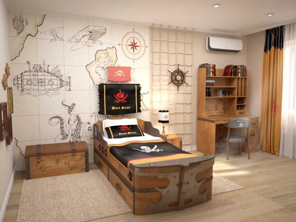 Популярной темой в морском стиле в детской комнатае для мальчиков является пиратская тема, она отлично развивает фантазию и активность ребенка