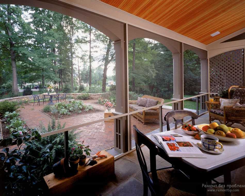 Первые не имеют стен в нормальном понимании. Таковые им заменяет небольшой заборчик, установленный по периметру. Оставшееся пространство лучше всего декорировать виноградом или плющом — они не дадут насекомым залетать на веранду летом и досаждать своим назойливым присутствием. Такие веранды намного дешевле, чем террасы закрытого типа.