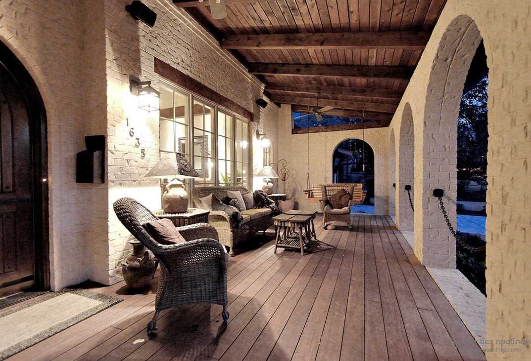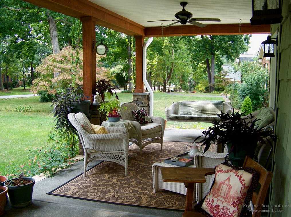 Если она находится с северной (или восточной) стороны дома, то лучше всего подойдет британский колониальный стиль, в котором присутствует удобная плетеная мебель, изготовленная из прочных натуральных материалов, таких, как ротанг, бамбук или красное дерево. Также в интерьере должны быть кресла-качалки и куча подушек со сменными чехлами. Напольное покрытие и мебель в данном случае могут быть темными, т.к. они не будут нагреваться в силу места расположения веранды