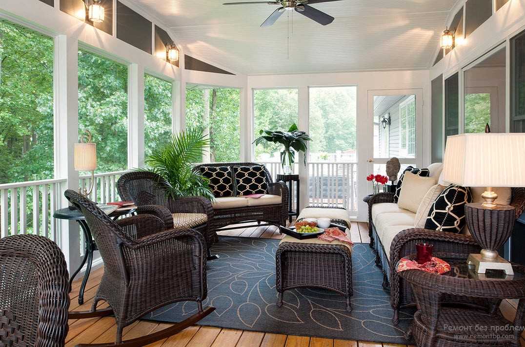 Существует несколько способов оформления веранды. Главным критерием в таком помещении загородного дома является наличие большого количества света. Но бывают моменты, когда избыток солнечных лучей не уместен. Для этого используют элементы способные уменьшить освещённость данного помещения: