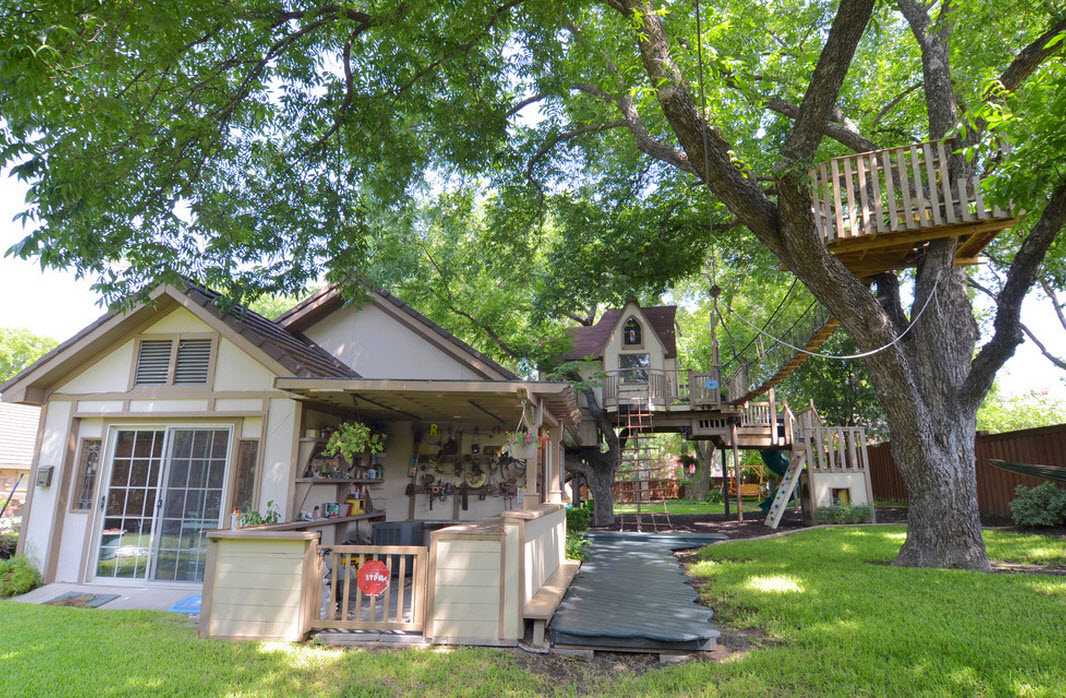 Несомненно, такую идею оценят маленькие члены семьи. Как же оформить такой домик? Это может быть просто небольшое строение с канатной или деревянной лестницей или же целый городок с горками, канатными дорогами, качелями и турниками.