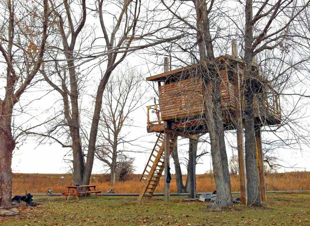 Домик на дереве может быть достаточно внушительных размеров и на максимально комфортной для хозяина высоте. Чтобы было удобно забираться в такое жилище можно сделать либо обычную, либо винтовую лестницу, или же установить строение на деревянной платформе, немного возвышающейся над уровнем земли.