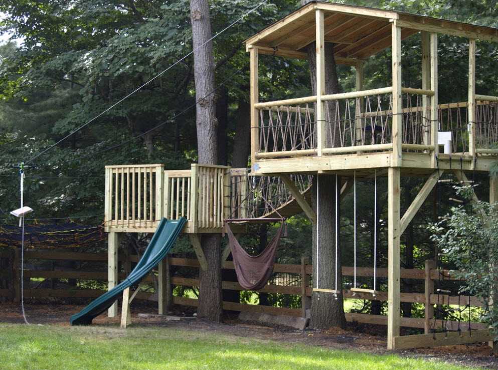 Местом строительства детского домика на даче может стать раскидистое дерево или стройная сосенка. Его можно спрятать в ветвях или соорудить вокруг ствола. Чтобы создать масштабный проект, в деле можно задействовать близлежащие деревья, соединив их с домом и между собой канатными дорогами, снабдив турниками, качелями, канатами и горками.