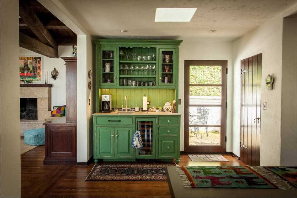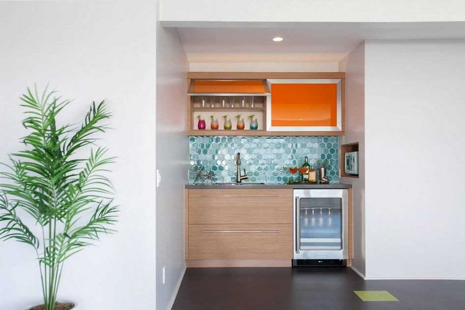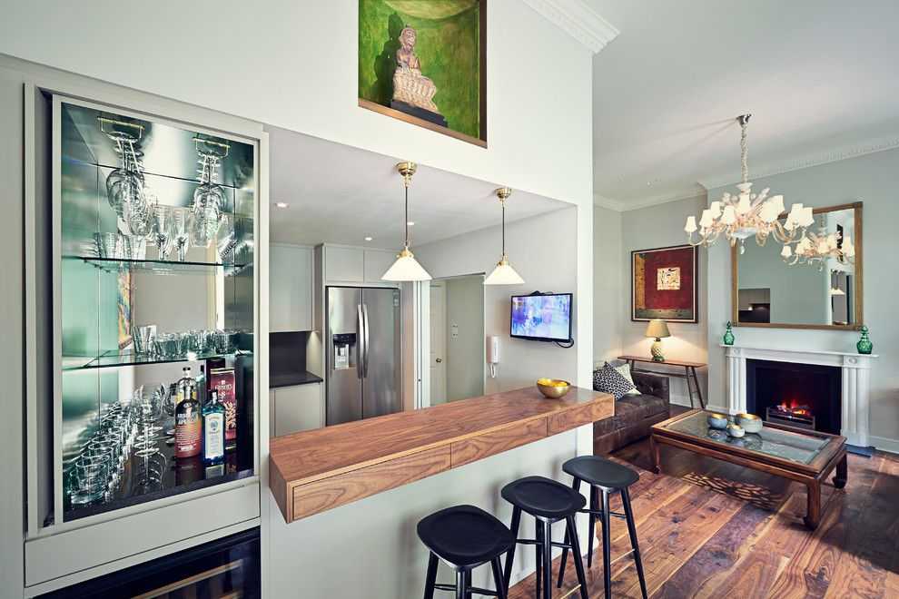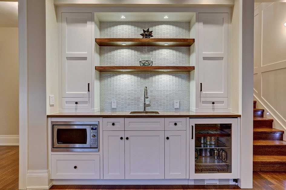 В первую очередь необходимо подумать о стилистике, поскольку бар должен гармонично сочетаться с остальной кухонной мебелью. Особенность заключается в том, что перестраивать на кухне ничего не нужно. Благодаря компактным размерам мини-бар вписывается практически везде.