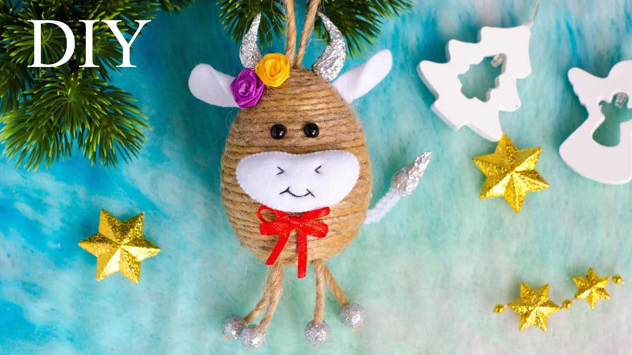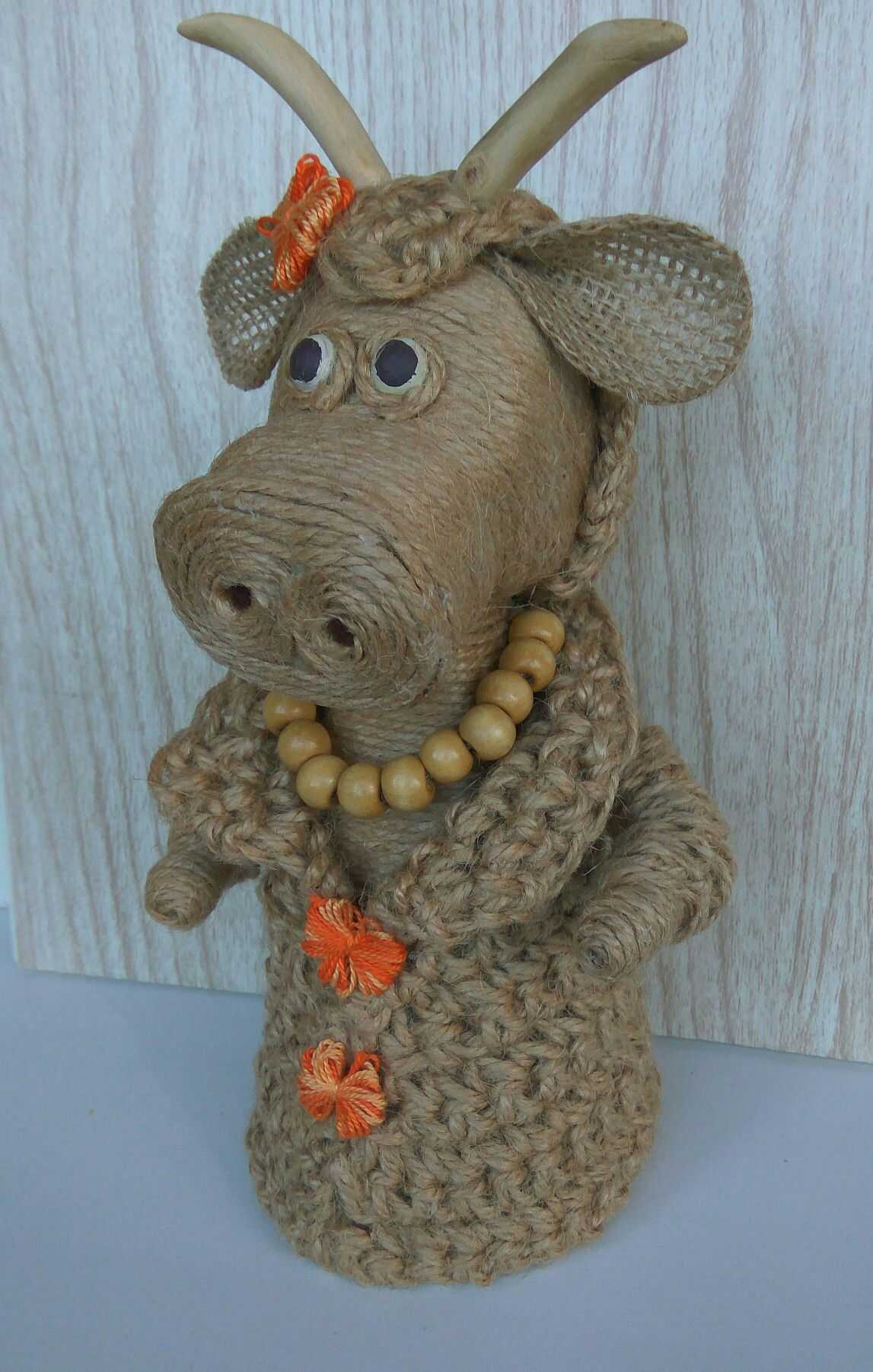 Для создания тотемного животного 2021 года, помимо перечисленных выше приспособлений, дополнительно понадобится пластиковый стаканчик, который будет выполнять роль туловища Быка. Скручиваем из проволоки заготовки – каркасы для рогов, ушей, хвоста и ног животного. Затем обматываем детали верёвкой или шпагатом, концы которых фиксируются при помощи клея. Следующим шагом будет закрепление частей фигурки на пластиковом стаканчике и обматывание используемым материалом всей основы. Отдельно скручиваем верёвку или шпагат в виде мордочки, прикрепляем к туловищу и украшаем глазками, забавной чёлкой, галстуком-бабочкой или рубашкой из мешковины с ярким поясом-тесьмой.