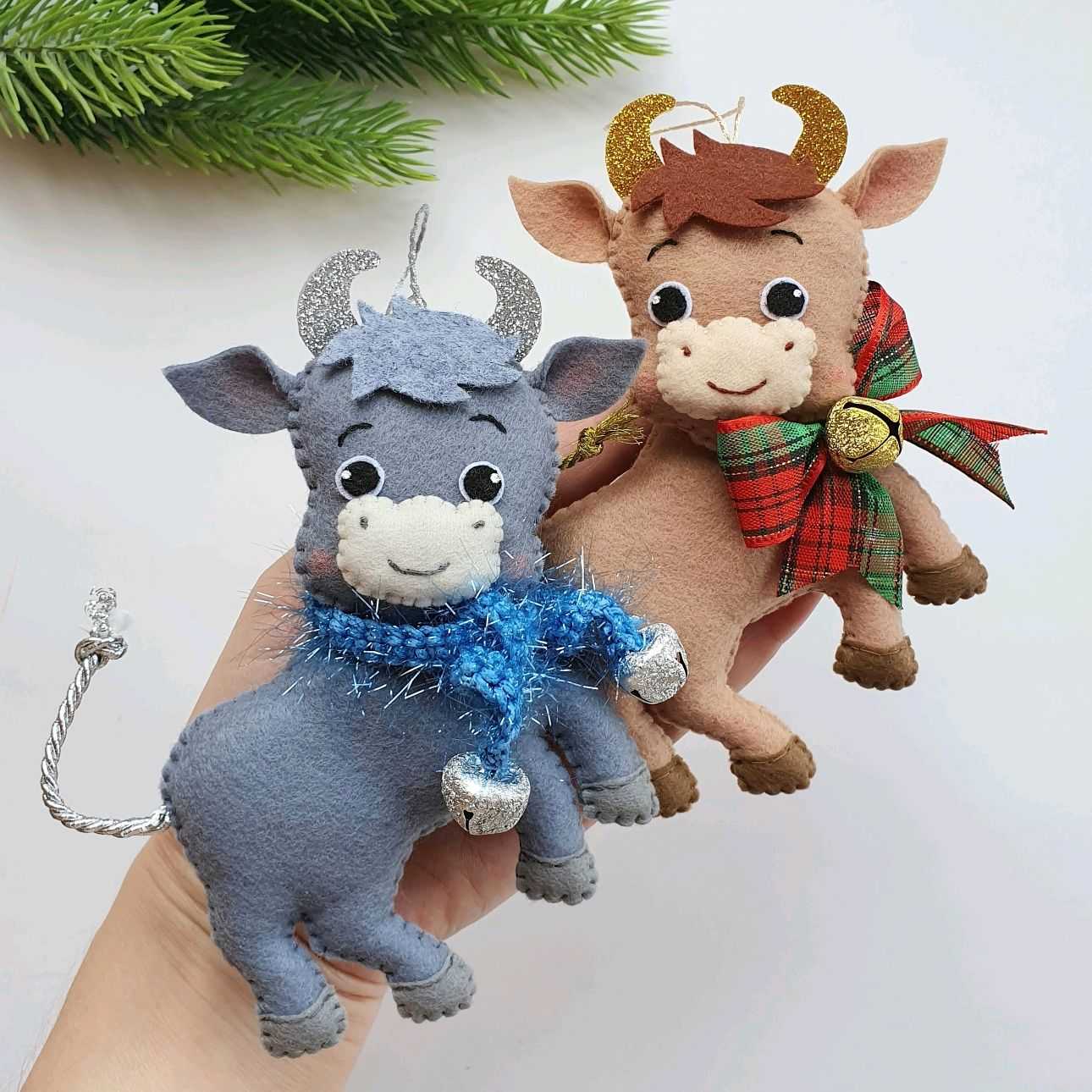 Любимым материалом для творчества у многих рукодельниц является фетр, представленный в различной цветовой гамме. Он очень легко поддаётся работе и не осыпается, поэтому создавать яркие и красивые поделки из него само удовольствие. Что касается новогодней тематики, то из фетра можно сшить как Быка впечатляющих размеров, так и небольшую объёмную фигурку. При этом использовать в работе швейную машинку совсем не обязательно.