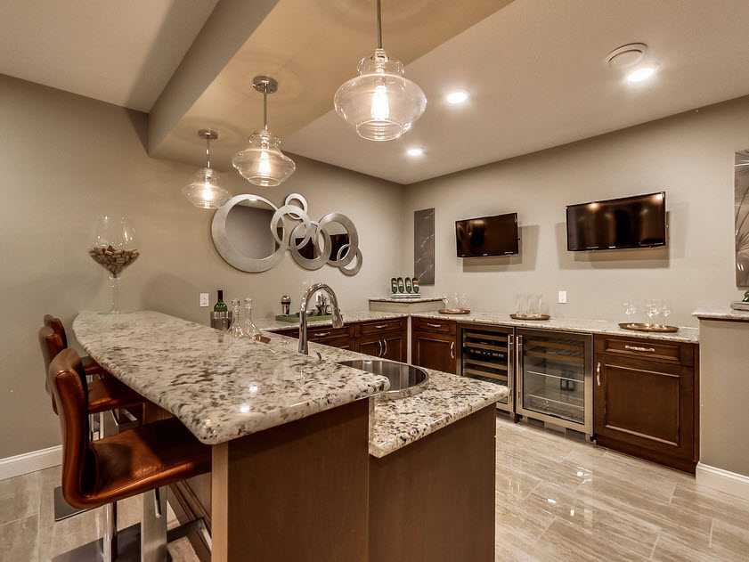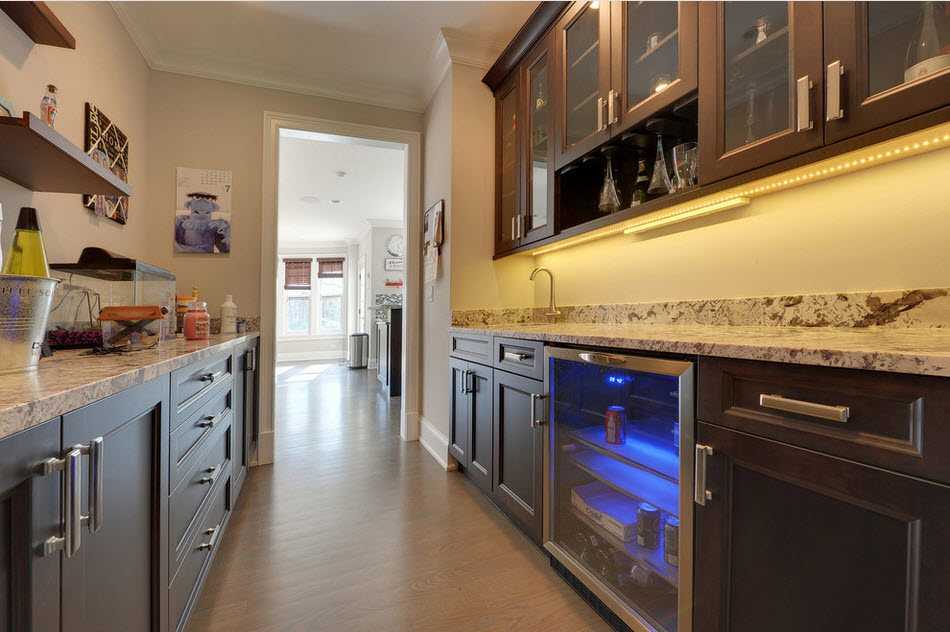 Следующий параметр — дизайн. Внешний вид мебели зависит от стиля интерьера. Для любителей современных направлений отличным вариантом станет «плавающий» бар. Его оснащают подсветкой, благодаря которой создается эффект парения. Такой дизайн считается эксклюзивным и превратит мини-бар в изюминку кухни.